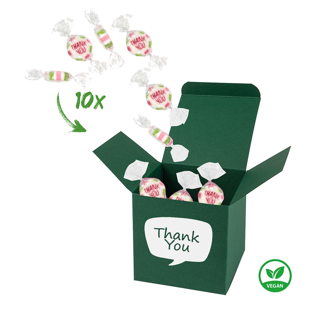 1 ColorBox Dunkelgrün gefüllt mit 10 einzeln gewickelten, handgemachten Rock-Hartkaramell-Bonbons "Thank You" je 5 g (vegan, vegetarisch & glutenfrei). • Quadratisch, flexibel und nachhaltig: die ColorBox ist ein Naturprodukt "MADE IN GERMANY" welches aus 100% Recyclingpapier hergestellt wird und in 13 leuchtenden Farben erhältlich ist. Zusätzlich gibt es die Box auch aus naturbelassenem GRASKARTON - das ist Nachhaltigkeit pur! Die ColorBox kann auf Wunsch mit einem 4c Aufkleber oder 1c Druck individualisiert werden, weitere mögliche Werbeanbringen sind eine Banderole 4c um die Box herum und ab 3000 Stück ein All-Over Druck 4c.