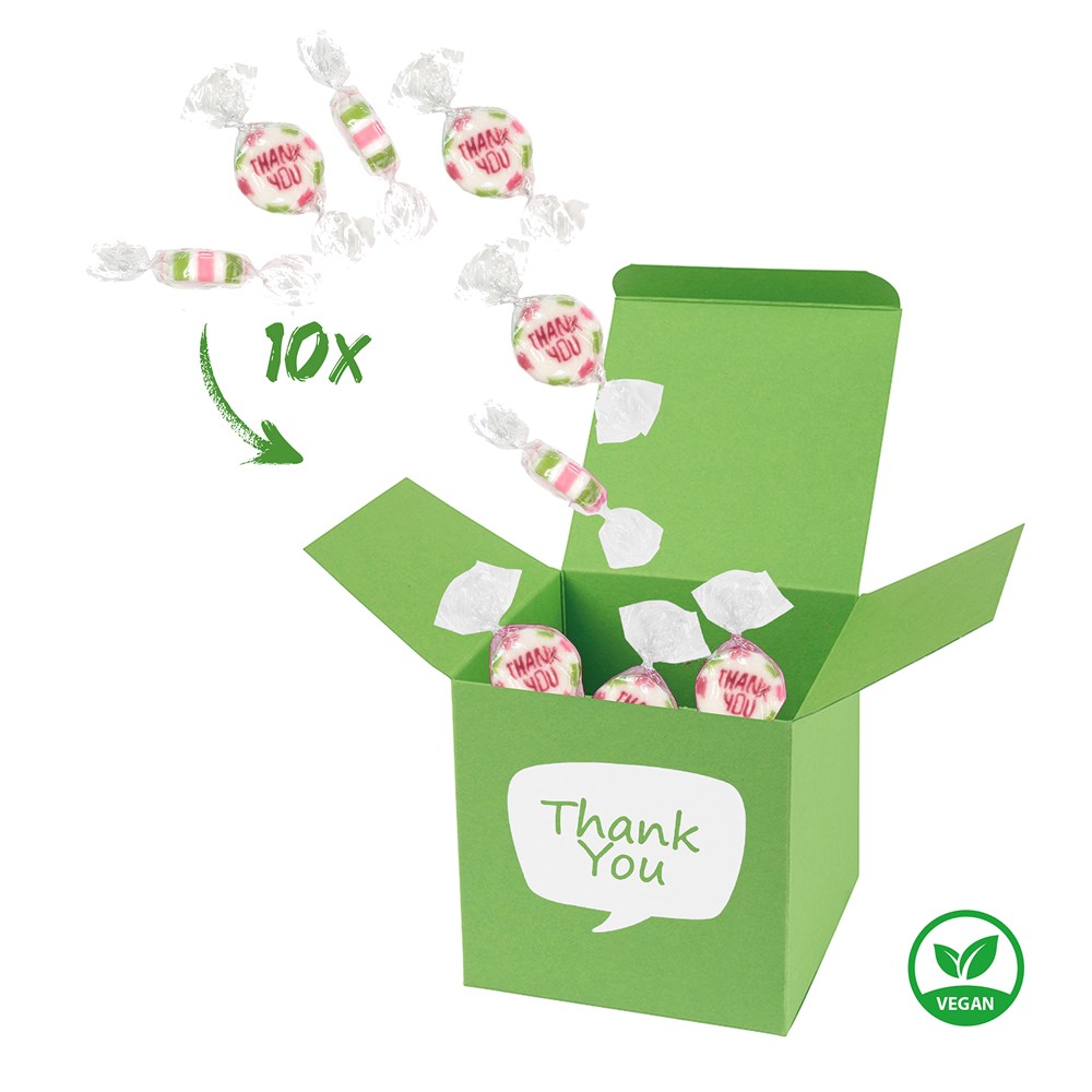 1 ColorBox Hellgrün gefüllt mit 10 einzeln gewickelten, handgemachten Rock-Hartkaramell-Bonbons "Thank You" je 5 g (vegan, vegetarisch & glutenfrei). • Quadratisch, flexibel und nachhaltig: die ColorBox ist ein Naturprodukt "MADE IN GERMANY" welches aus 100% Recyclingpapier hergestellt wird und in 13 leuchtenden Farben erhältlich ist. Zusätzlich gibt es die Box auch aus naturbelassenem GRASKARTON - das ist Nachhaltigkeit pur! Die ColorBox kann auf Wunsch mit einem 4c Aufkleber oder 1c Druck individualisiert werden, weitere mögliche Werbeanbringen sind eine Banderole 4c um die Box herum und ab 3000 Stück ein All-Over Druck 4c.
