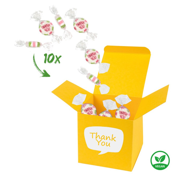 1 ColorBox Gelb gefüllt mit 10 einzeln gewickelten, handgemachten Rock-Hartkaramell-Bonbons "Thank You" je 5 g (vegan, vegetarisch & glutenfrei). • Quadratisch, flexibel und nachhaltig: die ColorBox ist ein Naturprodukt "MADE IN GERMANY" welches aus 100% Recyclingpapier hergestellt wird und in 13 leuchtenden Farben erhältlich ist. Zusätzlich gibt es die Box auch aus naturbelassenem GRASKARTON - das ist Nachhaltigkeit pur! Die ColorBox kann auf Wunsch mit einem 4c Aufkleber oder 1c Druck individualisiert werden, weitere mögliche Werbeanbringen sind eine Banderole 4c um die Box herum und ab 3000 Stück ein All-Over Druck 4c.