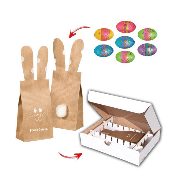 1 original Bunny Bag Osterhasen-Papiertüte mit Standard-Druck 1c "Frohe Ostern"", gefüllt mit 7 bunten Schoko-Ostereiern je 6,3 g, inkl. Konfektion der Tüte in eine neutrale, weiße Versandbox. • Bunny Bag – das ist die ultimative Osterhasen-Tüte! Ein neckischer Blick, lange Ohren, ein Stummelschwänzchen aus reiner Baumwolle und Standard-Druck "Frohe Ostern". Ein ökologisch wertvoller Hingucker, gefüllt mit Köstlichkeiten von Lindt. Die Bunny Bag kann optional mit einem 4c Druck, 1c Druck oder einem 4c Aufkleber individualisiert werden, dabei kann sowohl auf der Vorderseite als auch auf der Rückseite die Werbeanbringung platziert werden - auf Wunsch auch auf beiden Seiten. Die spezielle Einzel-Versandbox für die Bunny Bag ist eine kostengünstige, flexible und individuelle Lösung für den Porto-optimierten Versand – Made in Germany. Der nachhaltige Versandkarton aus 70% recyceltem Material und 30% Material aus kontrollierter Waldwirtschaft ist „Briefkasten tauglich“ und kann somit kostengünstig als Maxibrief versendet werden. Der Versandkarton hat eine Höhe von 4,8 cm und der flexibel steckbare Gittereinsatz dient zur Fixierung der Bag, so wird sichergestellt, dass die schicke Tüte auch unbeschadet beim Empfänger ankommt. Alle Außenseiten der Mailing-Box sind individuell 4c bedruckbar, zusätzlich kann auch der Deckel auf der Innenseite mit einem 4c Druck gestaltet werden. Auf Wunsch übernehmen wir den kompletten Versandservice – Preis auf Anfrage.