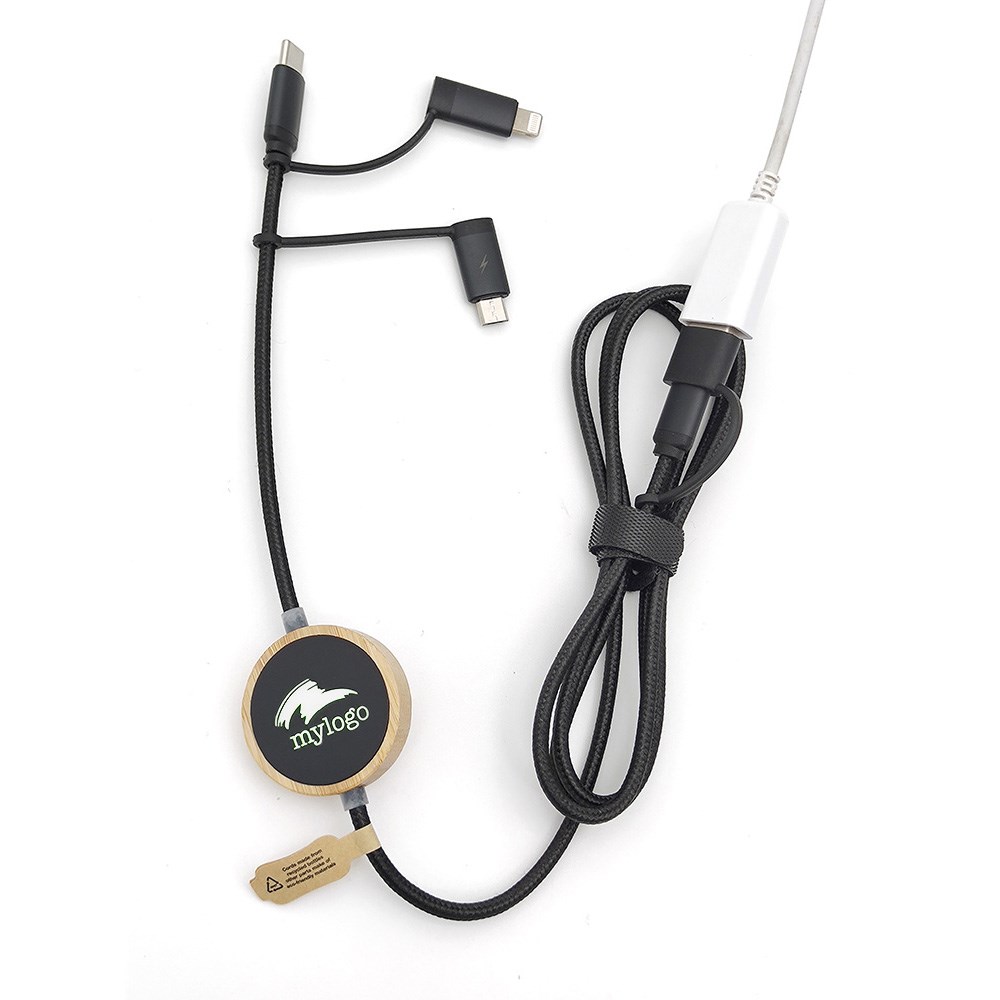 LED Blickfang aus RPET und Bambus. RPET 5 in 1 Ladekabel Bambus Unser nachhaltiges 5 in 1 Ladekabel ist ca. 120 cm lang. Eingang USB Type-C Stecker mit Adapter auf Type A Stecker auf Ausgang Type-C Stecker mit Adaptern für iPhone Lightning und Micro USB. PD Type C-Type C: 20V/3A ,60W Type C-Apple: 5V/2.4A ,12W Type C-Micro: 9V/2A ,18W USB A-Type C: 9V/2A ,18W USB A-Apple: 5V/2.4A ,12W USB A-Micro: 9V/2A ,18W Einzelverpackt im schicken nachhaltigen Recycling Geschenkkarton mit Kurzanleitung.