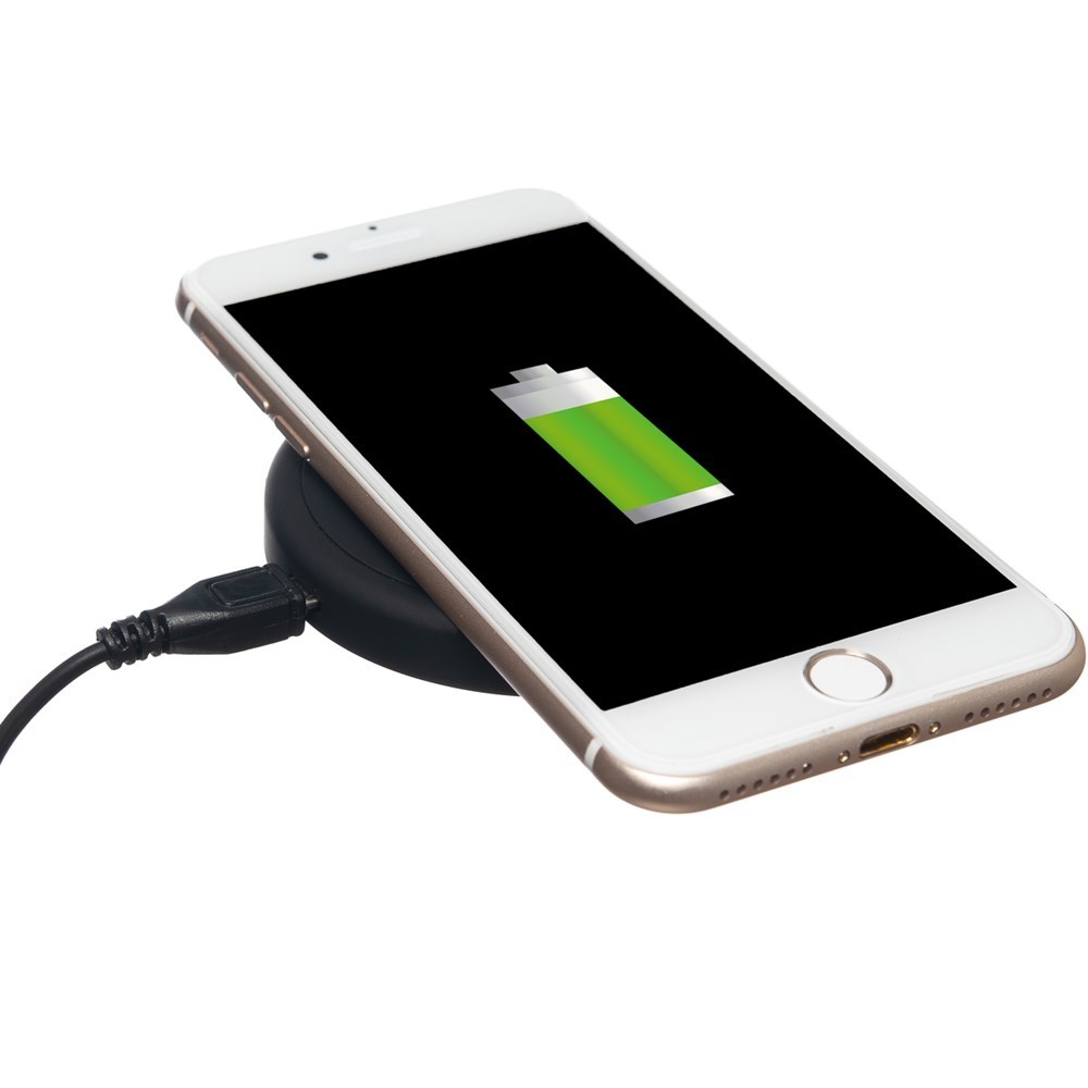 Kabeloses Laden mit der QI-button Ladestation mit hinterleuchtetem Logo