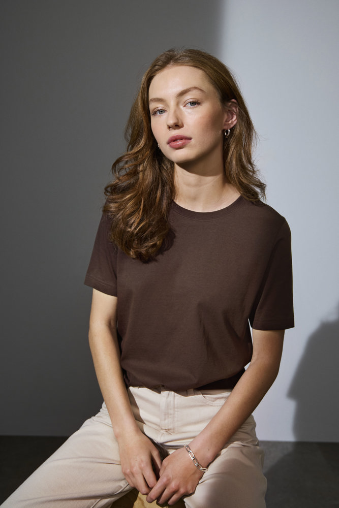 Klassisches T-Shirt mit femininem O-Ausschnitt, vierlagigem Halsbündchen sowie Nacken- und Schulterband. Behält seine Form nach jeder Wäsche.