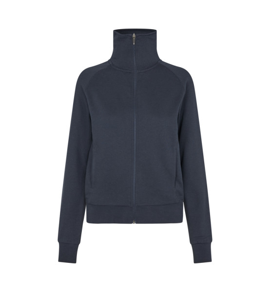 Jacke in kräftiger Qualität mit durchgehendem Reißverschluss, zwei Schubtaschen und Raglanärmel. Nackenband, Ripp an Ärmeln und Bund und schicke Flatlocksteppnähte. Weiche, angeraute Innenseite. Leicht figurbetont.