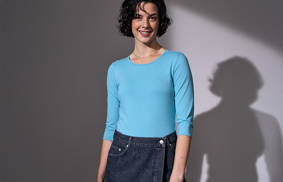 T-Shirt in angenehmer Baumwollqualität mit Stretch, ¾-Ärmeln und O-Ausschnitt. Schmales Bündchen an Hals und Ärmelloch. Körpernahe Passform.