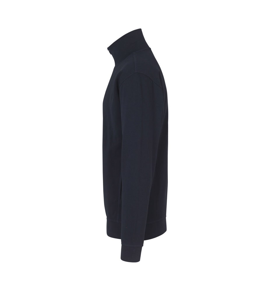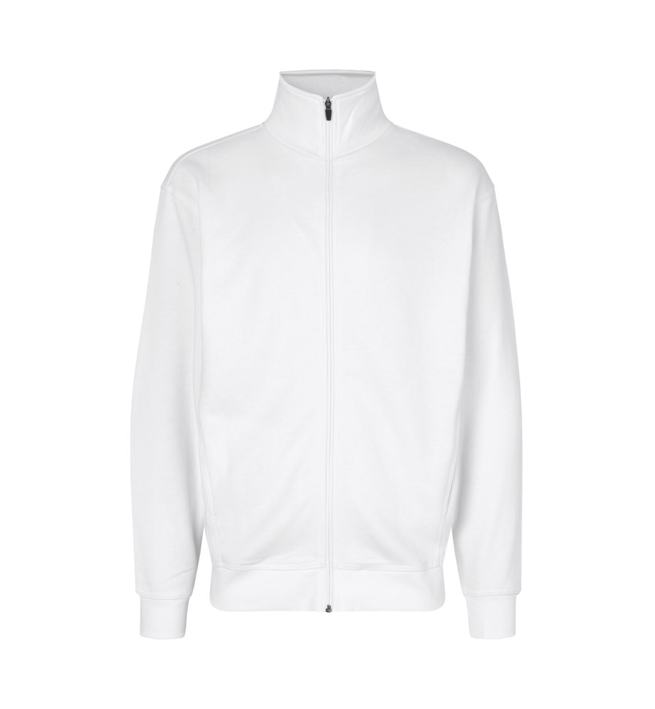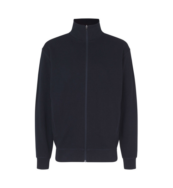 Jacke in kräftiger Qualität mit durchgehendem Reißverschluss und zwei Schubtaschen. Nackenband, Ripp an Ärmel und Bund und schicke Flatlocksteppnähte. Weiche, angeraute Innenseite.