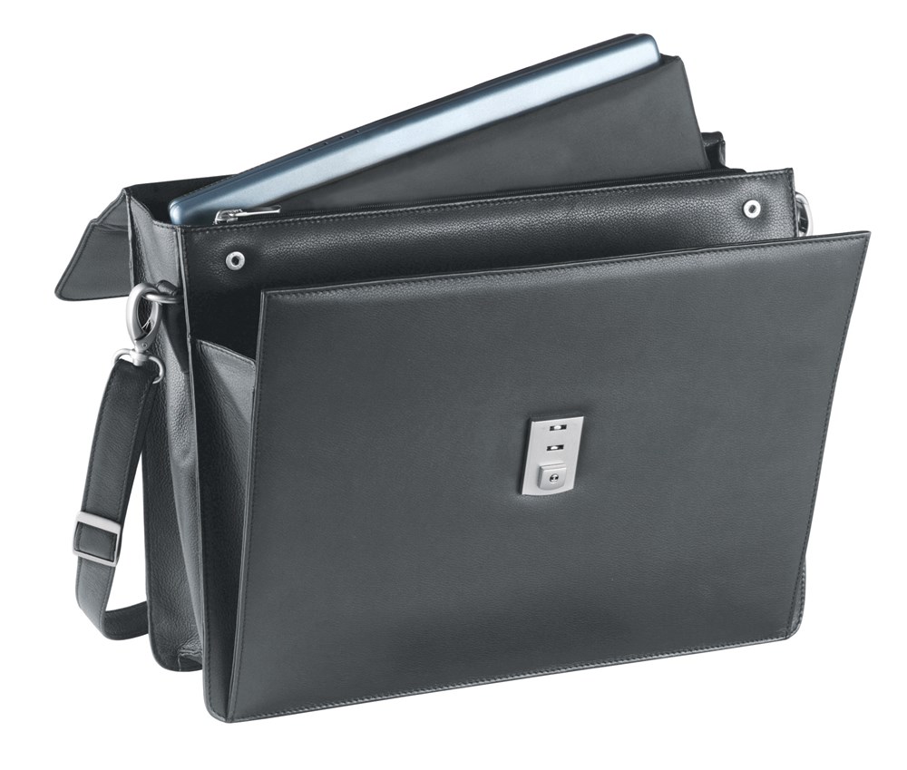 mit Griff, abnehmbarem Schultergurt, herausnehmbarem Laptopfach, Vortasche mit Reißverschluss- und Einsteckfach, Stiftschlaufen, Handyfach; innen je zwei Reißverschluss- und Faltenfächer; Reißverschlussfach auf der Rückseite