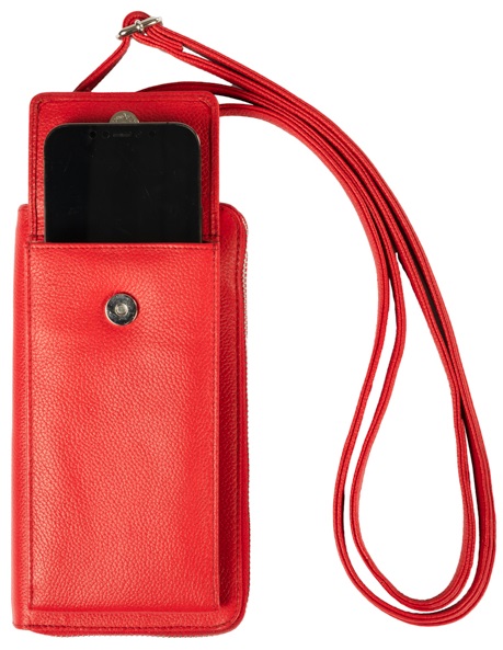 Frontfach mit Druckknopf für Handys, mit Metall-RV und Lederanhänger, mit 2 Lederschlaufen und D-Ringen oben, mit Tragegurt aus Leder (ca. 155 x 1,2 cm) an 2 Karabinern, Innen: Münzfach mit RV, verschiedene Kartenfächern, 3 Scheinfächer