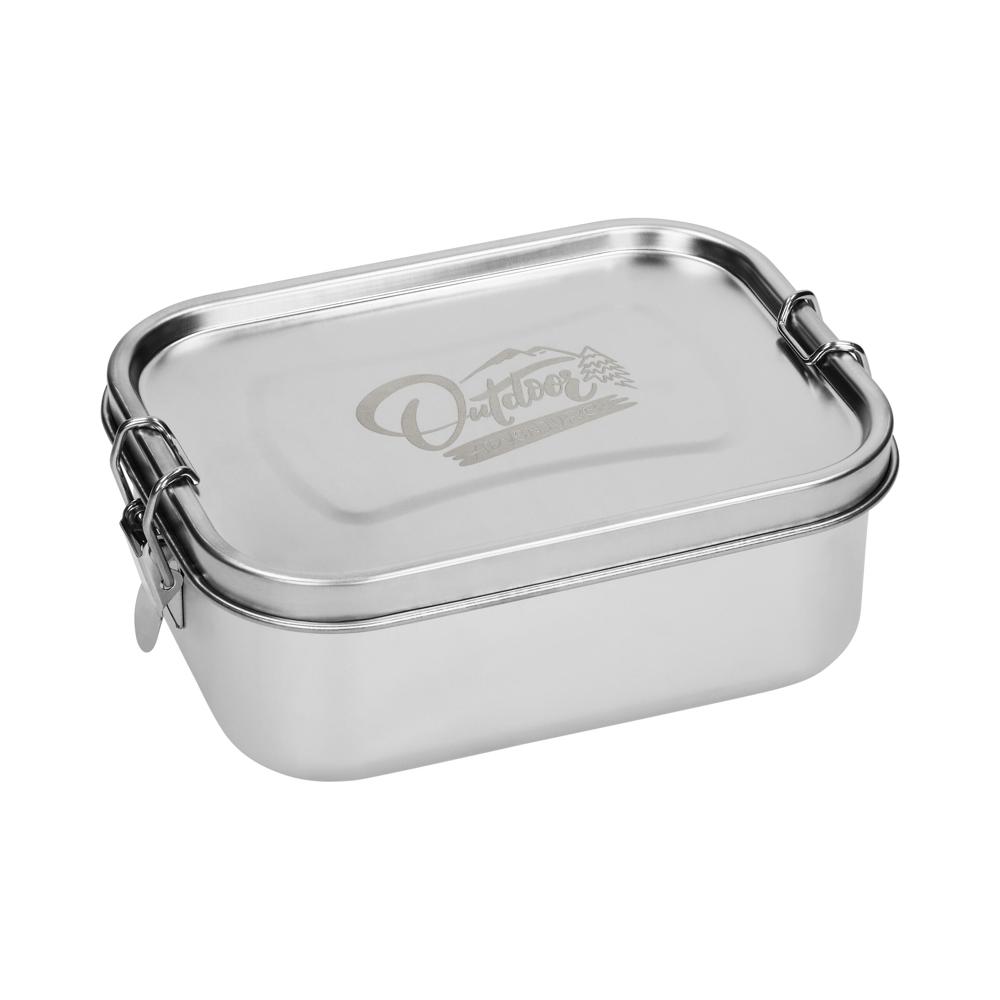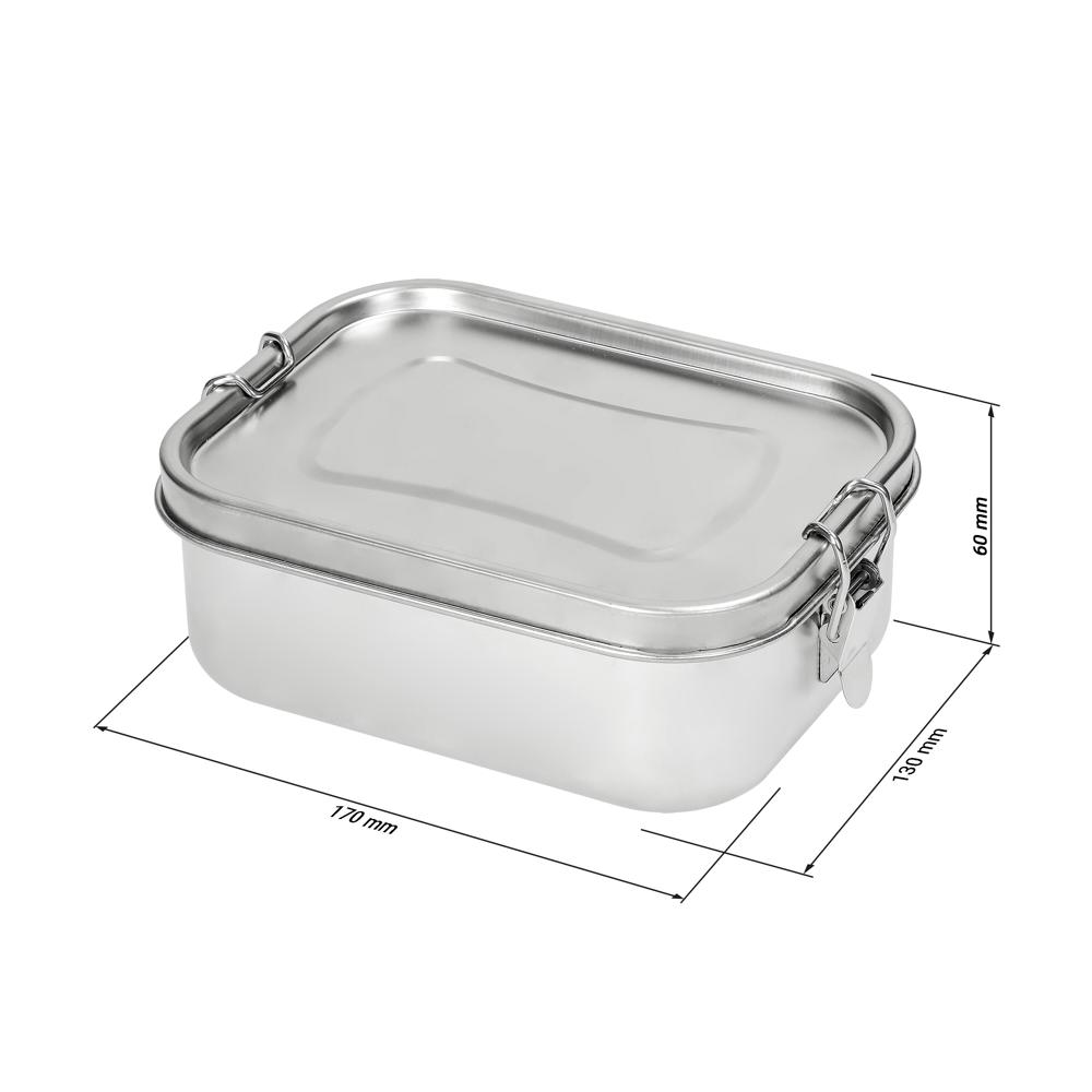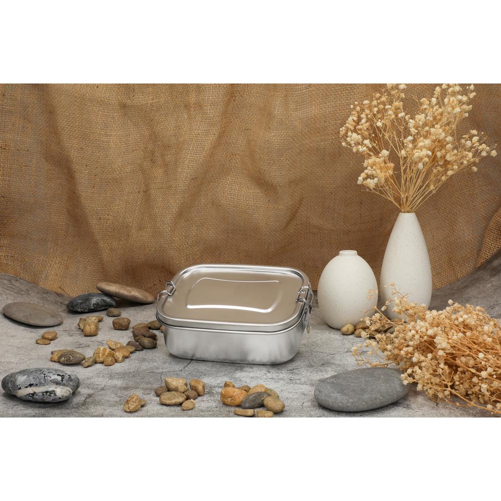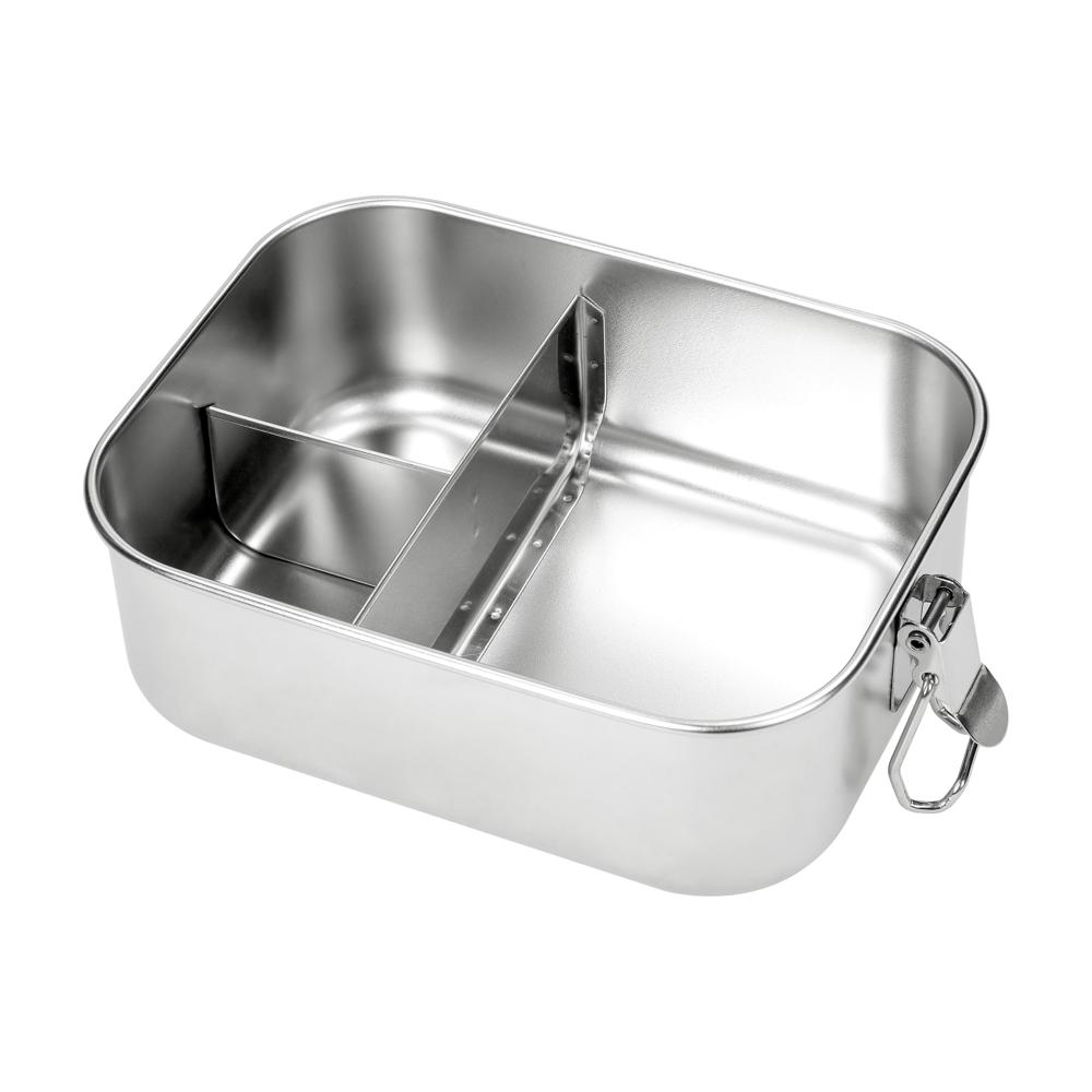 Ideal für's Mittagessen oder Zwischendurch. Die Vorratsdose aus Edelstahl ist nach der Nutzung immer wieder verwendbar, was sie zur perfekten umweltfreundlichen Alternative zu Alu- und Frischhaltefolien. Die fest verschweißten Fächer im Inneren der Box - erkennbar an den Schweißpunkten an der Unterseite der Box - sorgen für die sichere Trennung verschiedener Lebensmittel. Sie verfügt über einen Dichtungsring und robuste Klemmbügel an den Seiten. Nicht für flüssige Lebensmittel geeignet.