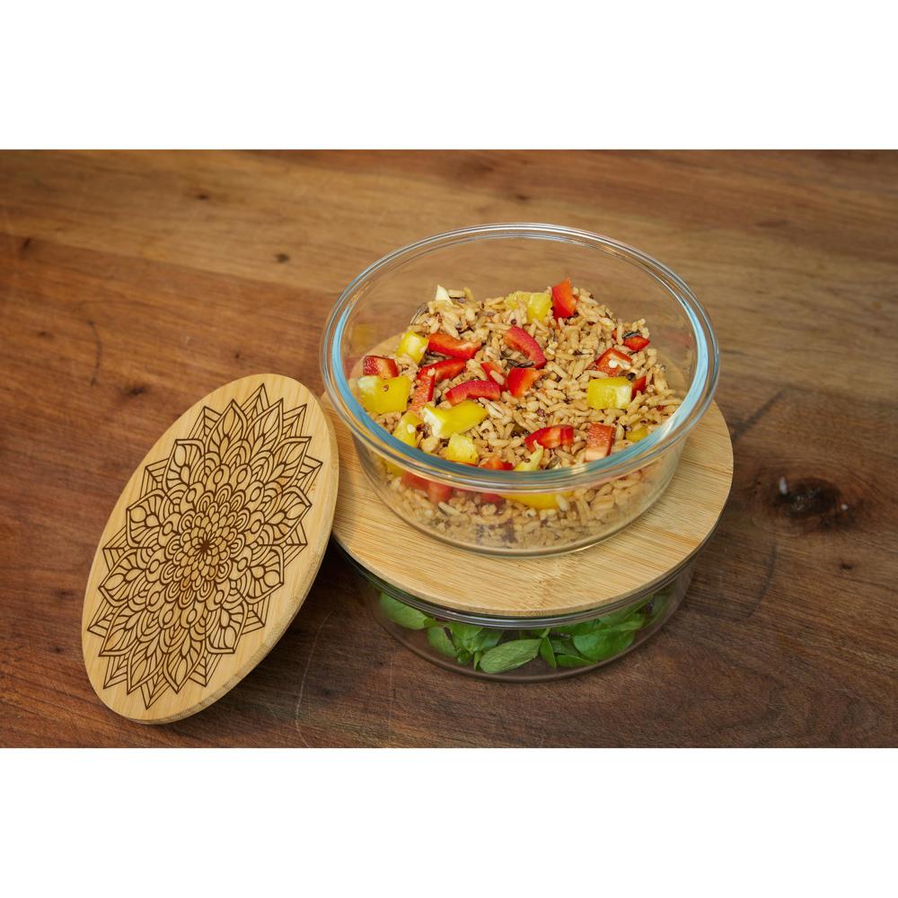 Schöne runde Box mit einer Schale aus hochwertigem und hitzebeständigem Borosilikat-Glas. Der Deckel aus Bambus verfügt über einen Silikonring und hält somit besonders gut auf der Schale. Die Glasschale ist für die Verwendung in der Mikrowelle geeignet.