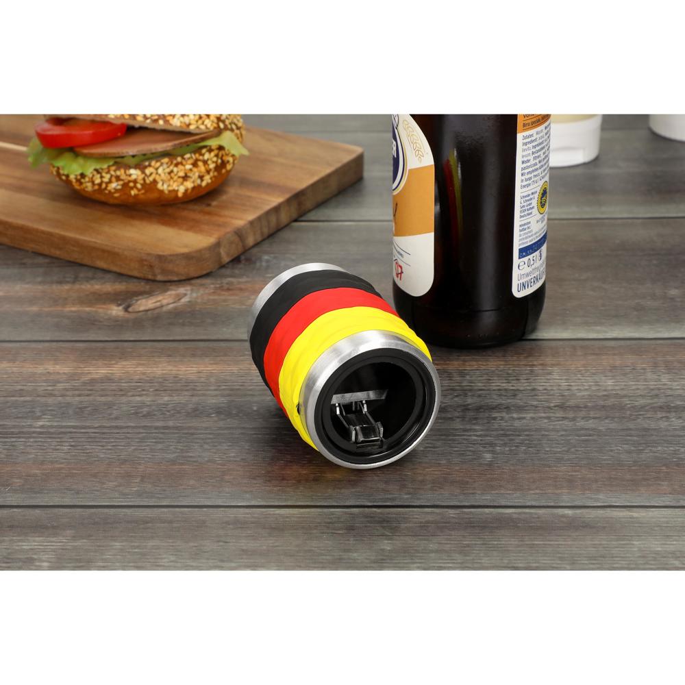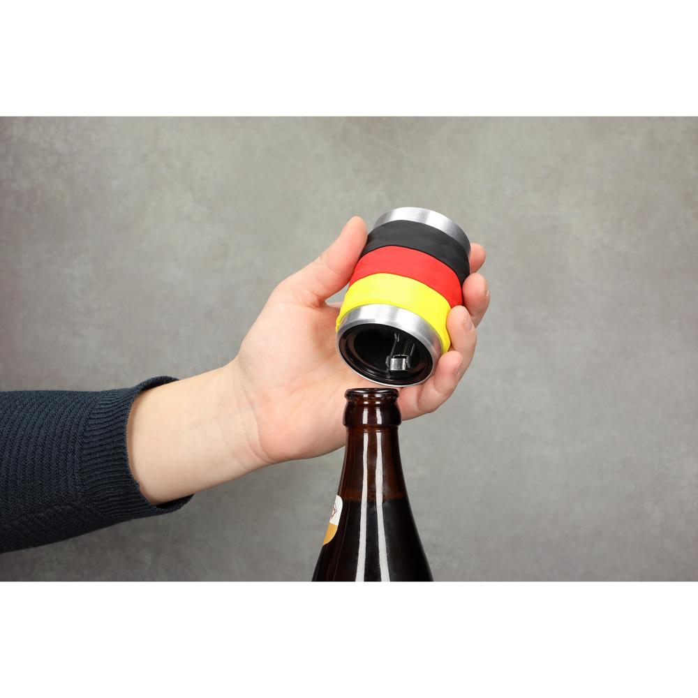 Dieser Kapselheber mit einer PVC-Manschette in Deutschlandfarben ist das perfekte Gadget für alle echten Fans. Kapselheber einfach auf die Flasche setzen, zügig nach unten drücken und gleich wieder abnehmen - fertig! Das Außen-Gehäuse besteht aus Aluminium in gebürsteter Edelstahl-Optik. Für alle Flaschen mit gängigen Kronkorken geeignet.