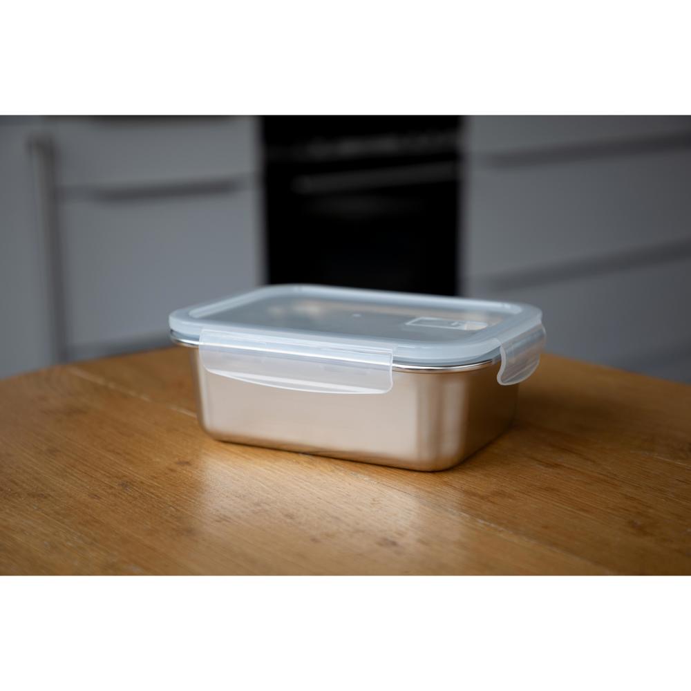 Die "Heat" Vorratsdose bietet eine praktische und gesundheitlich unbedenkliche Lösung zur Aufbewahrung Ihrer Lebensmittel. Sie ist auslaufsicher, mikrowellengeeignet und der Deckel ist aus geschmacks- und geruchsneutralem Kunststoff gefertigt. Das Unterteil ist aus robustem Edelstahl und somit ist der gesamte Artikel zu 100% recycelbar.