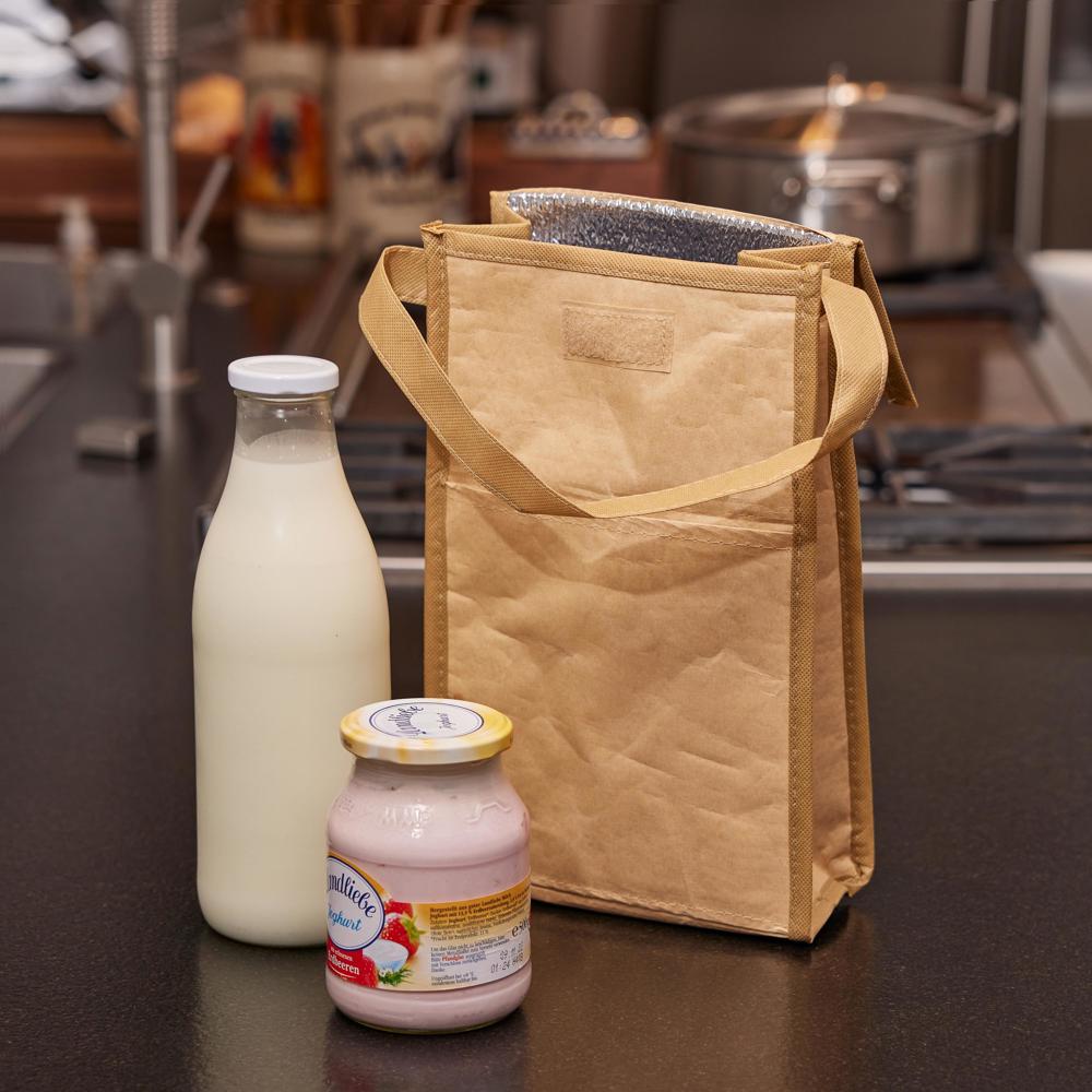 Eine Papiertasche mit Überraschungseffekt. Außen ist die Tasche aus Kraftpapier gefertigt und hat vorne ein zusätzliches Einsteckfach. Das Hauptfach ist mit 2 mm starker, isolierender Aluminiumfolie ausgekleidet, was den Transport von temperaturempfindlichen Lebensmitteln ermöglicht. Mit praktischem Henkel und Überschlagdeckel mit Klettverschluss sowie farblich passendem Piping.