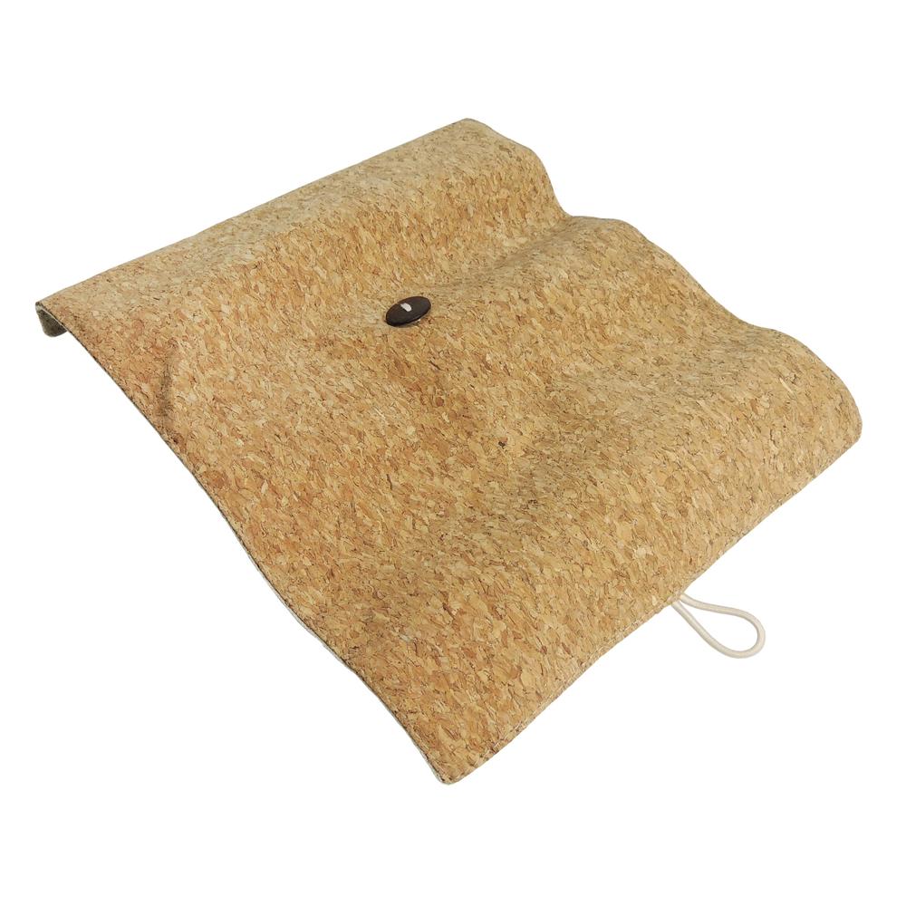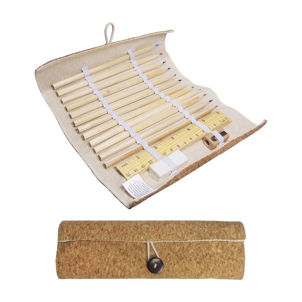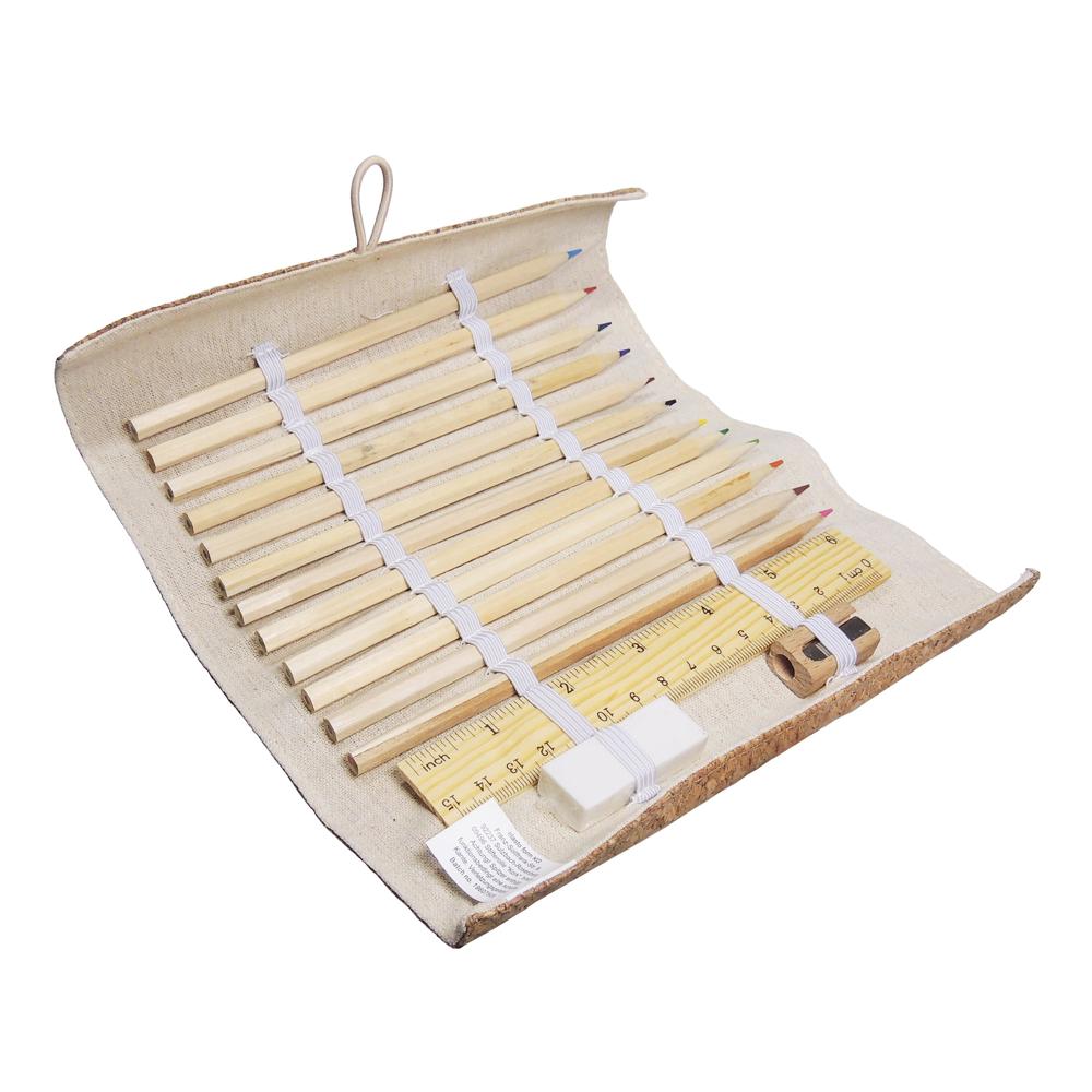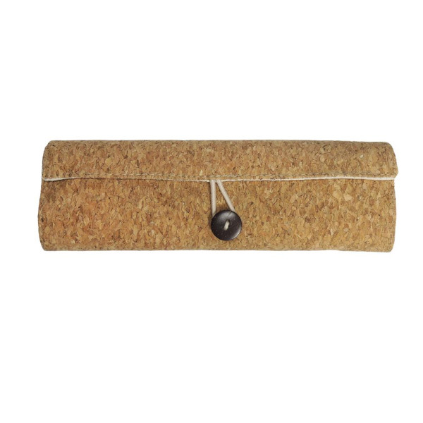 Flexibler Kork. Stifte-Rolle mit Naturkork bezogen. Die Innenseite ist aus leinenfarbenem Textil und beinhaltet einen Radiergummi, einen Spitzer, ein Holzlineal und 12 Buntstifte aus naturbelassenem Holz. Der Überschlag verhindert ein Herausfallen von Utensilien. Verschlossen wird die Rolle mittels Knopf und Gummischlaufe.