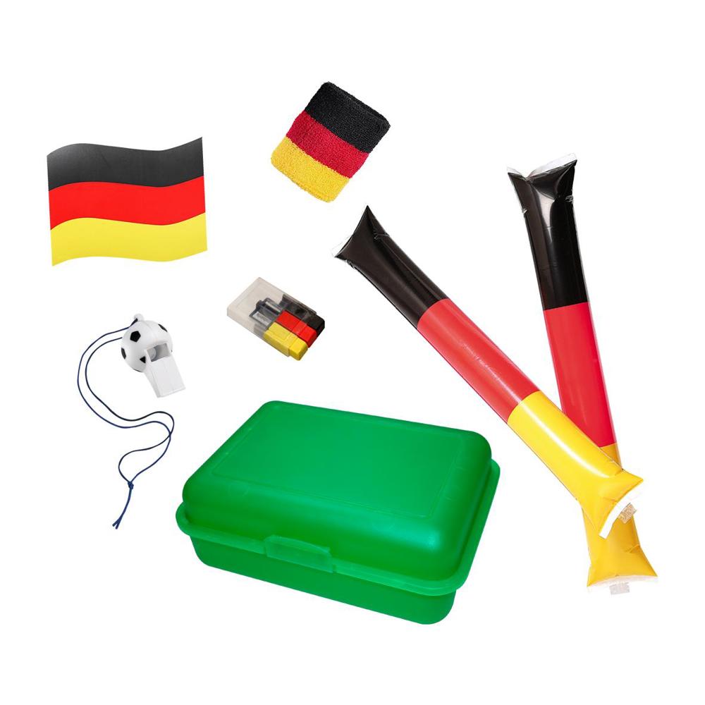 Perfektes Fanset, nicht nur für die Damen, mit Vorratsdose (05236), Klopfschlauch (07740), Automagnet (07332), Fanschminke (07409), Schweißband (07459) und Pfeife (07236). Beim IMould-Motiv auf der Box kann zwischen Standard (siehe Abbildung) oder einem individuell gestalteten Motiv (ab 500 Stück) gewählt werden.