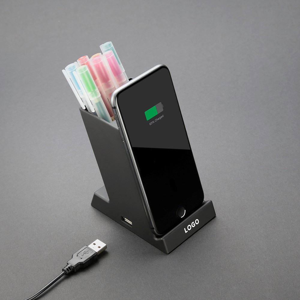 Ein Must-Have für jeden modernen Arbeitsplatz. Glow Desk ist Stiftehalter, kabellose 15 W Ladestation, Smartphone-Halterung und USB-Hub in Einem. Mit Ihrem Logo als beleuchtete Gravur in der matten Soft-Toch Oberfläche sind Sie bei Ihren Kunden stets im Blick und so lange im Kopf.