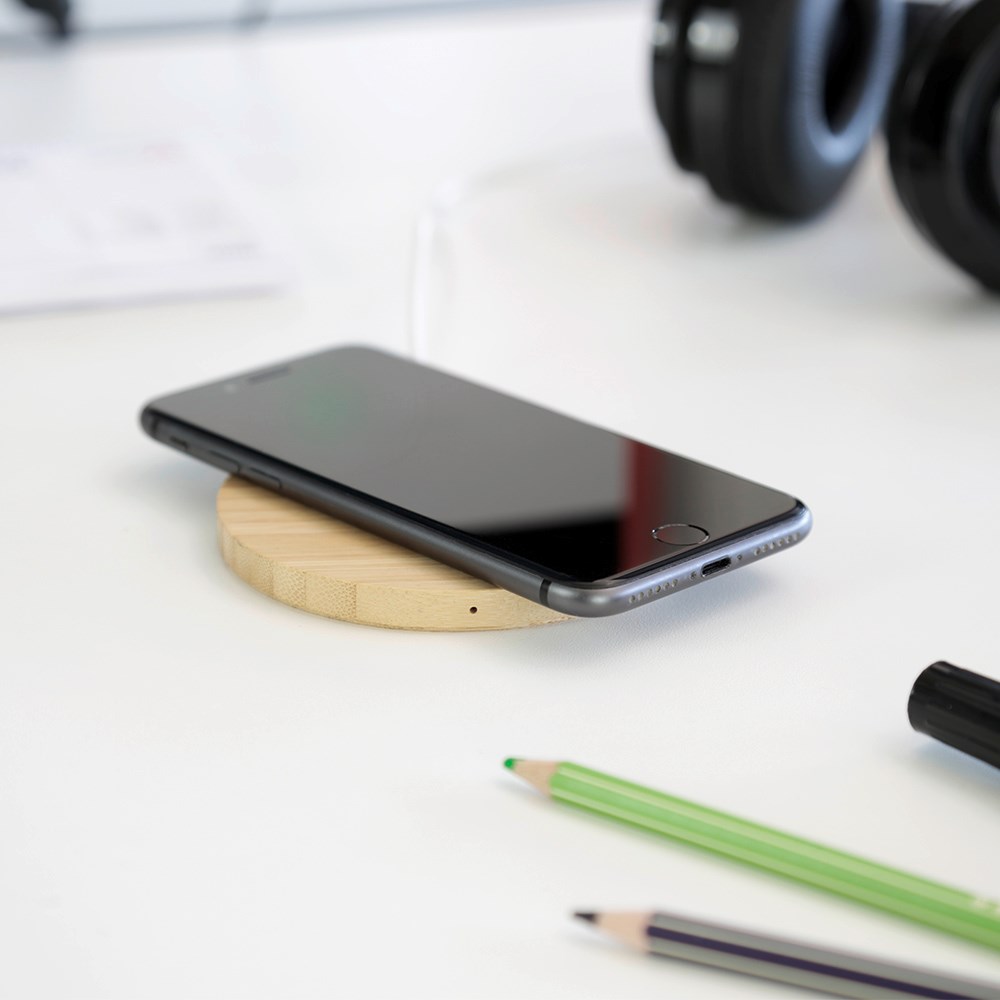 EasyCharge Bamboo – Natur trifft HighTech! Schlicht schöner Wireless Charger aus schnell nachwachsendem Bambusholz. Praktisch und stilsicher lädt es jedes wireless-fähige Smartphone durch einfache Berührung mit bis zu 15W wieder auf. Mit Ihrem Logo als elegante Gravur – ein echter Blickfang auf jedem Schreibtisch.