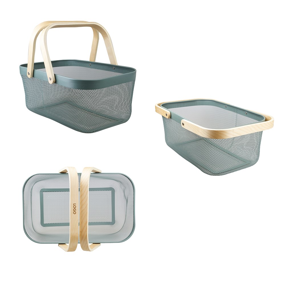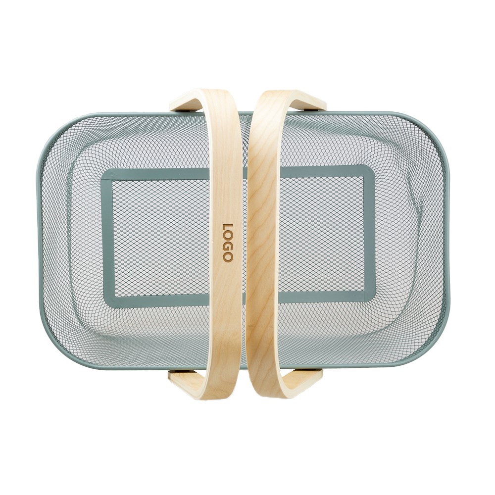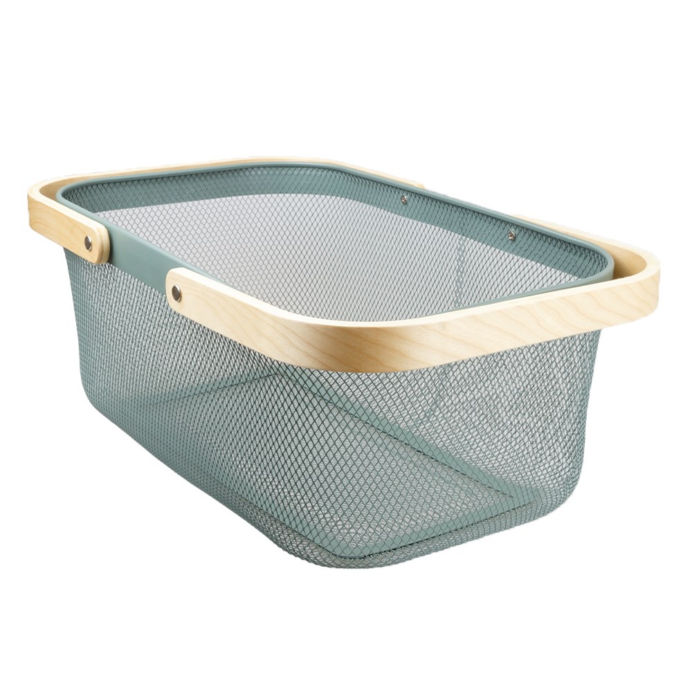 Großer, salbeifarbener Aufbewahrungskorb aus stabilem Stahlgeflecht mit Griffen aus Birkenholz. Perfekt als stilvolle Aufbewahrungslösung für Arbeits- oder Hobbysachen, als Stauraum für Accessoires oder als Einkaufskorb für den Marktbesuch. Abmessung: 400 x 250 x 170 mm; Optional mit Logogravur am Birkenholzhenkel.