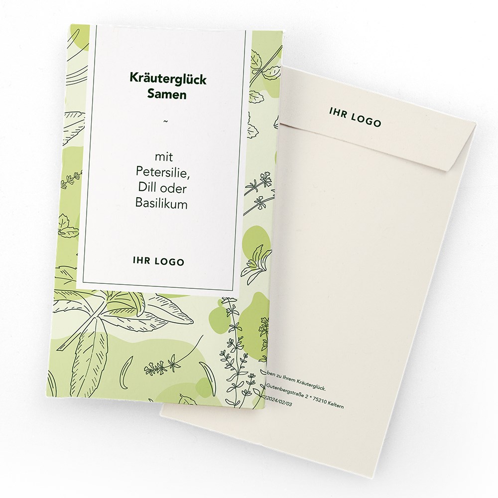 In Ihrem Corporate Design bedrucktes Samenbriefchen aus weißem Recyclingkarton. Befüllt mit hochwertigen Kräutersamen für bis zu 300 Pflanzen. Samen einfach in Anzuchterde aussäen, feucht halten und das köstliche Aroma selbst angebauter Kräuter genießen. Der perfekte Streuartikel ab 1.000 Stück. Sie haben die Wahl zwischen: Basilikum-, Dill- oder Petersiliesamen.