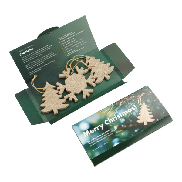Das 2nd Matter Weihnachtsset bringt Nachhaltigkeit an den Weihnachtsbaum. Enthalten sind drei liebevoll gefertigte Anhänger aus 96 % Ernteresten. Innen und außen nach Wunsch gestaltbar – ideal für stimmungsvolle und umweltfreundliche Weihnachtsgrüße.
