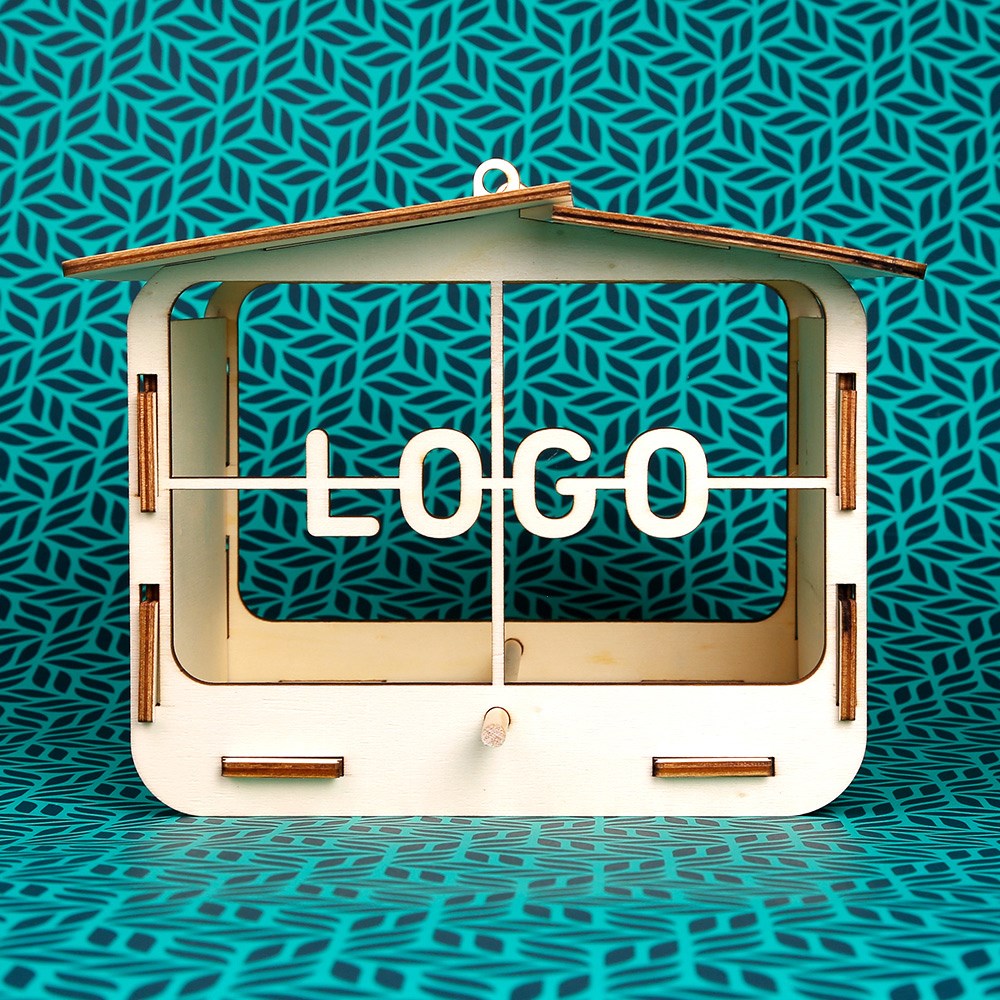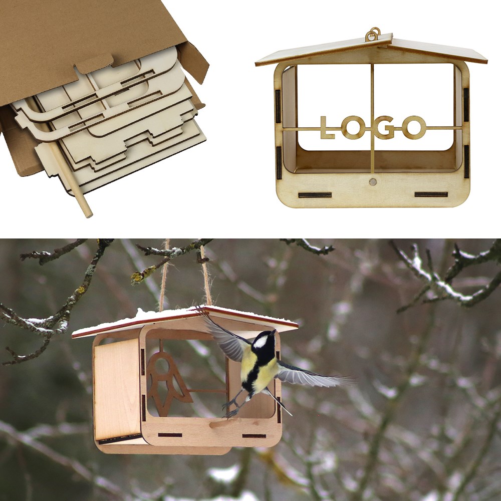 Mit diesem Bausatz für ein Vogelfutterhäuschen wird in wenigen, einfachen Schritten ein attraktives und notwendiges Futterangebot für heimische Garten- und Wildvögel geschaffen. Dabei ist die Verantwortung, die Sie als Unternehmen für den heimischen Artenschutz übernehmen nicht zu übersehen. Denn Ihr Logo - als Laser-Cut Kontur bildet eine gesamte Seitenwand des Häuschens. Im Set mit acht Steckteilen aus unlackiertem, zertifiziertem Holz und Bauanleitung. Zum Hängen oder Stellen im Garten oder auf dem Balkon.