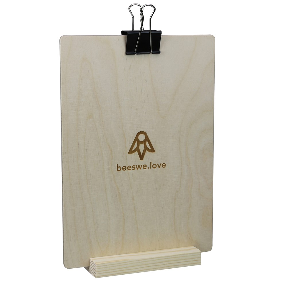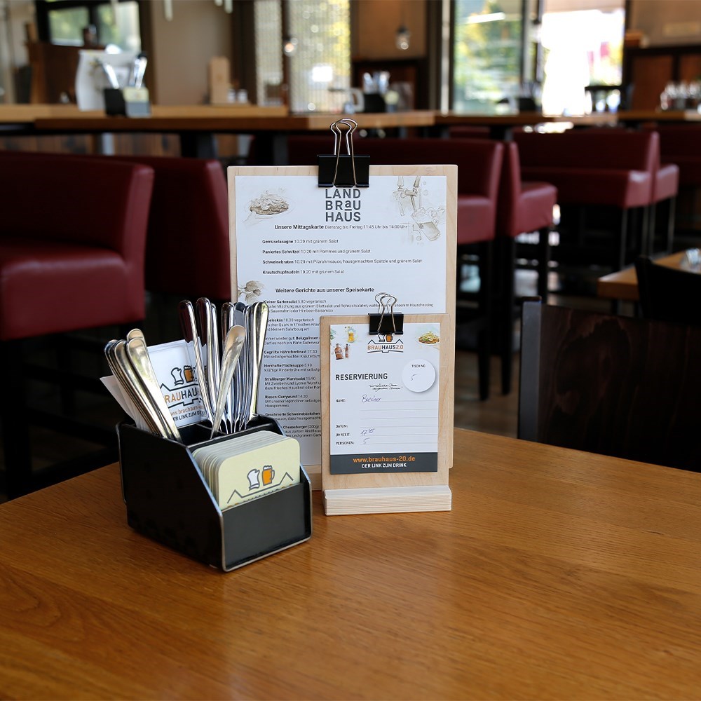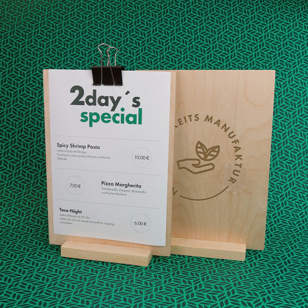 Speisekarten oder Produktinformationen – alles hat hier seinen Platz! Tischaufsteller Sets aus unserer Schreinerei kommen mit Halterung, Brett, Klammer und Fuß und Ihrem Logo als Gravur auf der Rückseite. Perfekt für Gastronomie, Shops oder Events!