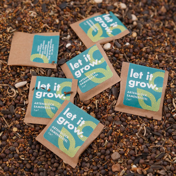 Reichhaltige Hausmischung Artenglück für eine 1qm große Blühfläche. Verpackt im braunen Keimschutzbeutel und fertig konfektioniert mit Ihrem individuellen Etikett.