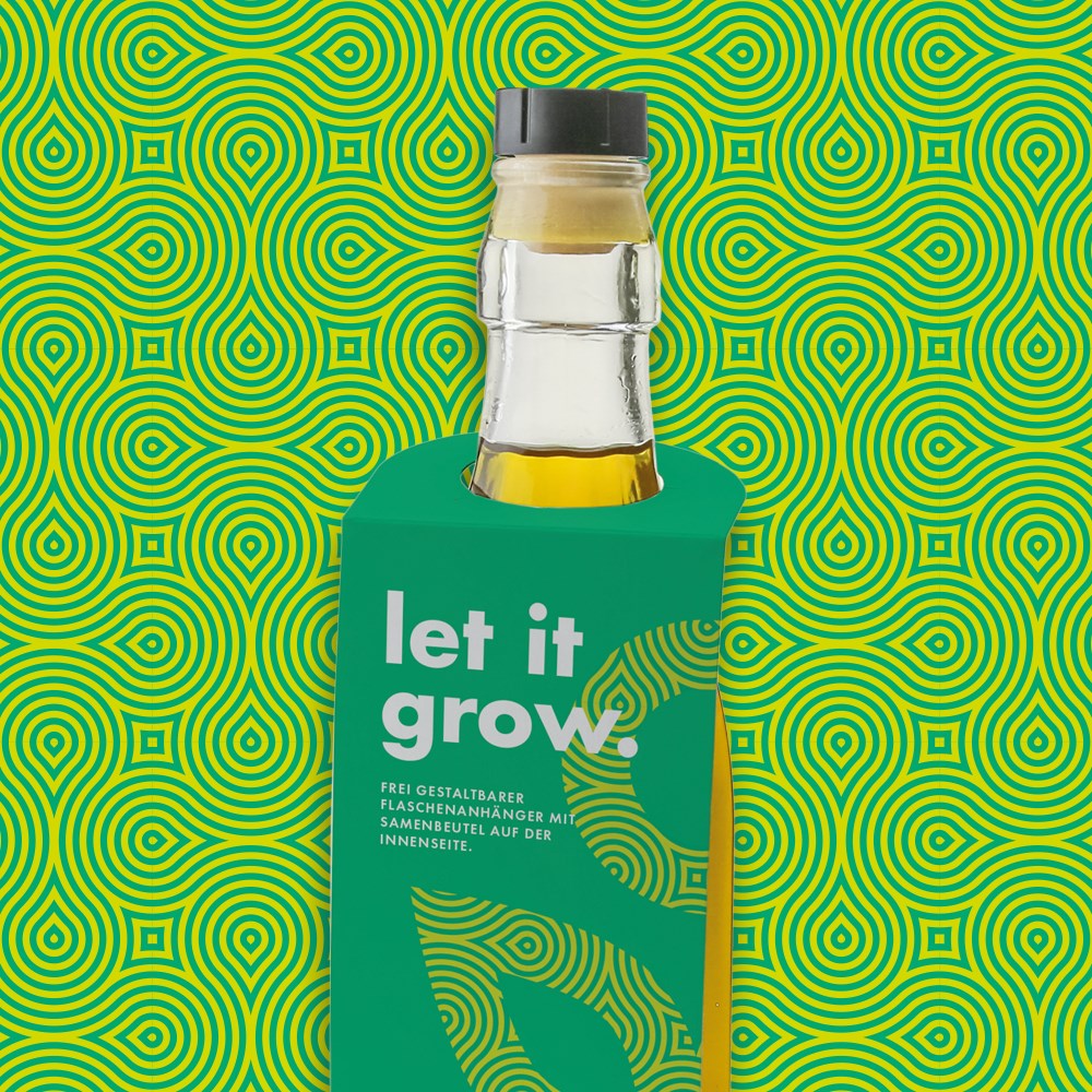 Frei gestaltbarer Flaschenanhänger mit Premium Samenbeutel „Artenglück 5 m²“ auf der Rückseite. Ein kommunikativer Mehrwert für Getränke, Öle o.ä.