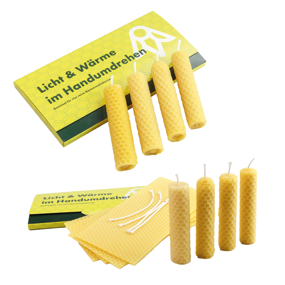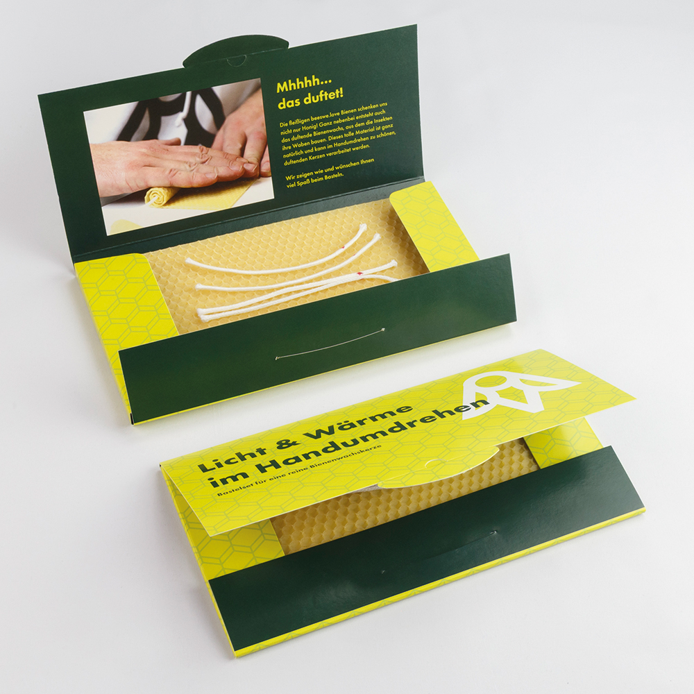 Kerzenbastelsets für vier reine Bienenwachskerzen. Ein Gruß voller Wärme und Licht für Ihr Klientel oder Ihre Mitarbeitenden.