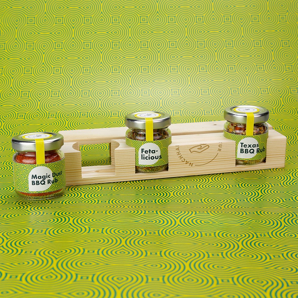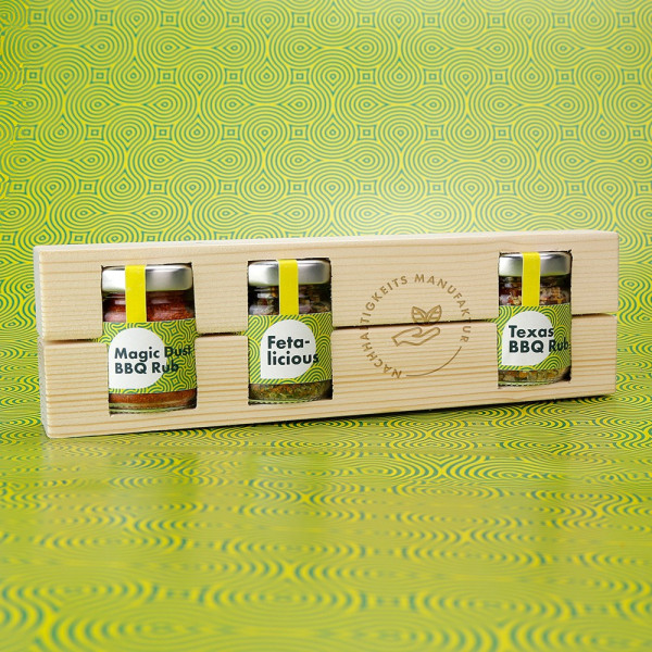 Dust BBQ Rub, # mini Texas BBQ Rub und einem #mini Glas Fetalicious machen dieses Magazin zu einem Geschenkset für echte Genießer! Mit Ihren individuellen Etiketen und optionaler Lasergravur auf dem Magazin.