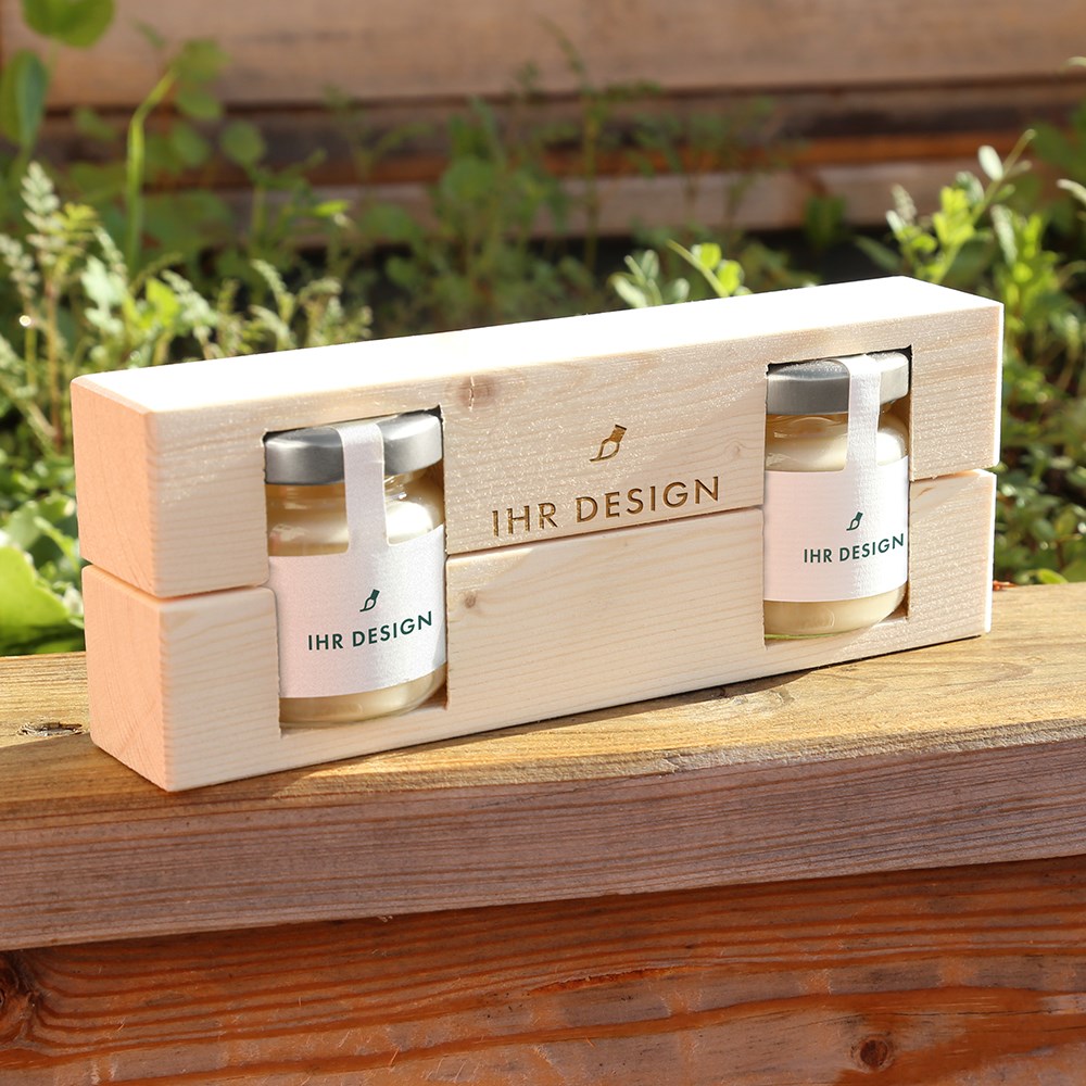 Unsere Magazine umrahmen Ihre kleinen Honiggläschen stilsicher und extrem attraktiv! Zusammen mit Etiketten in Ihrem Corporate Look und Logo-Lasergravur auf dem Holz entsteht ein einzigartiges Geschenksets mit Aussagekraft und Charme. Mit 2 x #mini Blütenhonig aus unserer deutschen beeswe.love Imkerei.