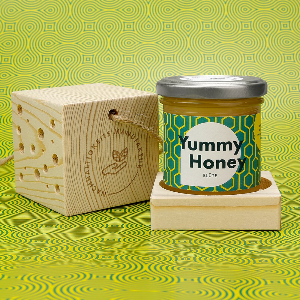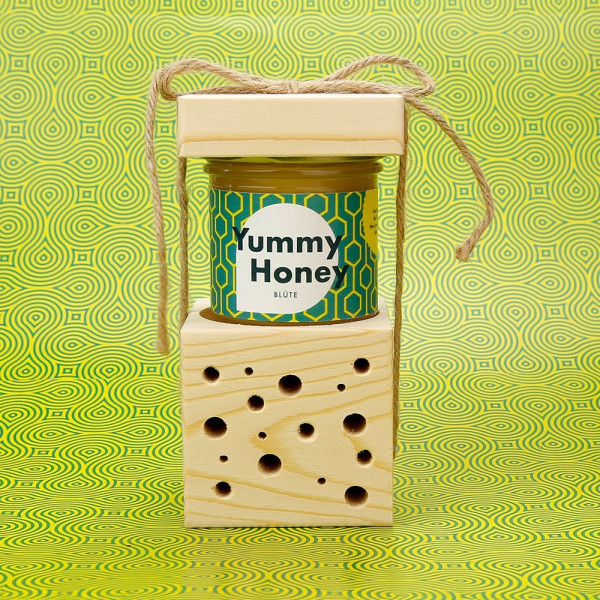 Raffiniertes 3in1 Prinzip für Ihr #midi Glas Blütenhonig: Einfach Kordel lösen, den schönen gefrästen Holzdeckel als Untersetzer für das Glas weiter nutzen und den Holzwürfel umgedreht als dekoratives und sinnvolles Insektenhotel auf Balkon oder Terrasse aufhängen. Mit Honig-Etikett in Ihrem Corporate Design, und Lasergravur auf dem Würfel. Auf Wunsch bieten wir Baumwollkordeln in verschiedenen Standardfarben als Alternative zur Jute-Kordel.
