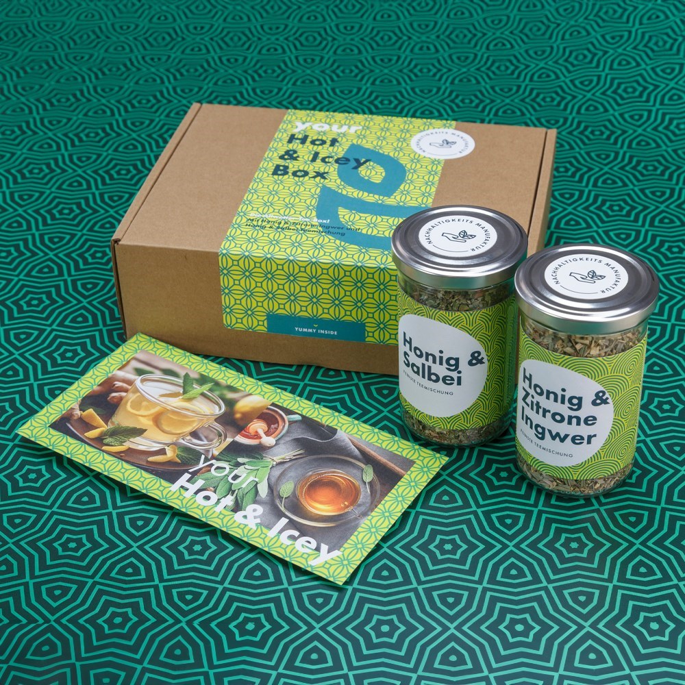 Die Allwetter-Teebox! Mit einem #maxi Glas Honig & Zitrone Ingwer Tee und einem #maxi Glas Honig & Salbei Tee, die sowohl kalt als auch heiß ein echter Genuss sind. Ein tolles und individuelles Werbegeschenk mit frei gestaltbaren Etiketten auf den Gläsern. Auf Wunsch mit Label in Ihrem Corporate Design auf der Geschenkbox und „Yummy Card“ mit tollen Rezeptideen. Gegen Aufpreis auch mit ReUse Deckel Ausstattung!