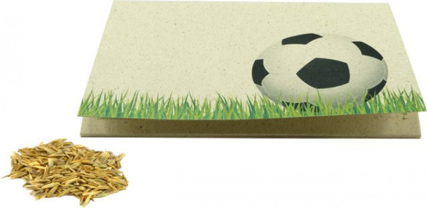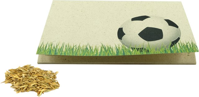 Nachhaltig und trendig. So präsentiert sich das Graspapier- Kärtchen mit den Sportrasen-Samen. Ein flacher Streuartikel, ideal als Mailingbeigabe für das angekündigte Sportereignis. Das Kärtchen bietet viel Platz für Ihre Werbebotschaft oder, ebenfalls ab 250 Stück, für Ihre individuelle Gestaltung. Inhalt: Samen für Fußball-Rasen (Sportrasen)