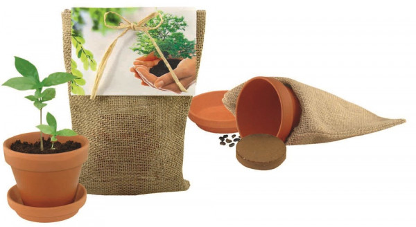 Ein Stück Natur im Jutesäckchen mit Tontopf und Unterteller, Erdtablette und Baumsamen. Die Robinie wird gerne an Straßenrändern gepflanzt, da sie sich günstig auf die CO2-Emission auswirkt. Ein sehr robuster und widerstandsfähiger Baum, mit weißen Blütentrauben und einer lichten Krone. In der ersten Wachstumsphase ist die Robinie als Pflanze für den Balkonkasten oder Kübel gut geeignet. Schnelles Wachstum, im ersten Jahr ca. 20-30 cm. Ausgewachsen ist die Robinie nach 50 Jahren und kann eine Höhe von ca. 30 m erreichen. Für den Werbeaufdruck ist Platz auf dem Standardmotiv im Header oder eine eigene Gestaltung des Headers, jeweils ab 250 Stück. Inhalt: Tontopf Ø 9 cm, Untersetzer, Erdtablette, Samen: Robinie