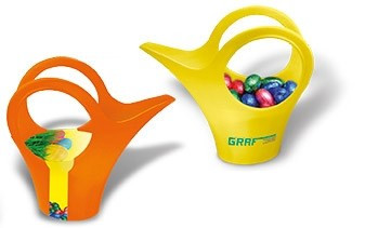Die Design-Gießkanne aus dem Hause Koziol exklusiv bei uns, mit Schokoladen-Eiern für das Osterfest. Ein Behältnis mit vielen Funktionen. Gerne anzusehen auf dem Schreibtisch und der Fensterbank. Standardfarben wählbar in weiß, grün, gelb oder orange. Wunschfarben auf Anfrage. Die umlaufende Banderole dient als Werbeträger. Platz für Ihren Eindruck ist im Standardmotiv oder eine eigene Gestaltung der Banderole, jeweils ab 250 Stück. Ein Tampondruck direkt auf der Gießkanne ist ab 100 Stück möglich. Inhalt: Kunststoff-Gießkännchen 0,2 l, 10 Schokoladen-Eier (je 6,5 g)