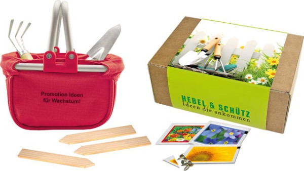 Der Utensilo „Garten“ ist perfekt ausgestattet für die erste Aussaat, mit einer handlichen Harke, Schaufel, Samentütchen (Zwergsonnenblume, Vergissmeinnicht, bunte Blumenmischung) und Holzstecketiketten. Der Werbedruck erfolgt auf dem Standardmotiv, ab 100 Stück