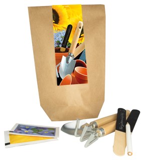 Inhalt: Gartengeräte (Harke, Schaufel, je ca. 17,5 cm), 2 Holzstäbchen, Stift weiß, 2 Samentütchen (je 80 x 55 mm): Zwergsonnenblume, Vergissmeinnicht