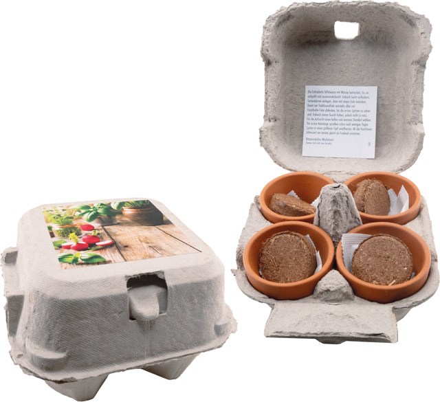 Inhalt: 4 Tontöpfchen Ø 4 cm, Erdtabletten, Samen: Basilikum, Kresse, Petersilie, Radieschen