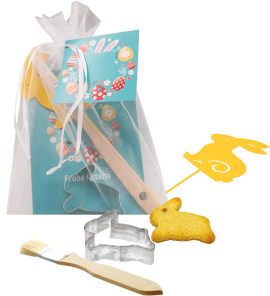 Mit der liebevollen Kombination aus Ausstechform, Backpinsel, Metallstecker und Rezeptkarte versetzen Sie Ihre Kunden im Handumdrehen in fröhliche Osterstimmung. Die Klappkarte bietet eine perfekte Bühne für Ihre Werbebotschaft: Ob mit Ihrem Logo oder einem individuell gestalteten Design – bereits ab 250 Stück machen Sie daraus ein persönliches Highlight. Inhalt: Grußkarte, Backpinsel, Metall-Stecker Hase gelb (ca. 205 x 60 mm), Ausstechform Hase ca. 5 cm (ohne Gebäck)