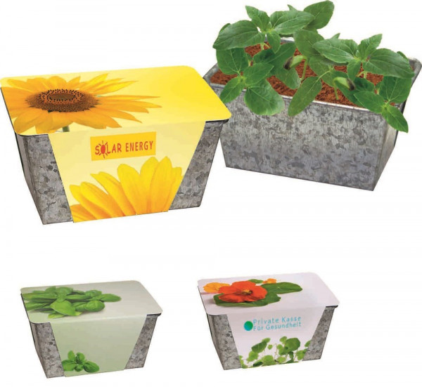 Metallic, modern, der kleine Zinkbehälter für die Anzucht Ihrer wachsenden Grüße. Eingelegt in das Wachstums-Kästchen sind Erdtablette und Zwergsonnenblumen-Samen. Die umlaufende Banderole bietet Platz für Ihre Werbebotschaft ab 250 Stück. Eine eigene Gestaltung der Banderole ist ebenfalls ab 250 Stück realisierbar. Inhalt: Erdtablette, Samen: Zwergsonnenblume