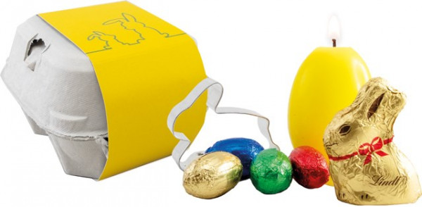 Schenken Sie Ihren Kunden Freude mit der naturigen Eier-Box und dem österlichen Inhalt: Ein Lindt Goldhase, Schokoladeneier, eine Ausstechform und eine Eikerze. Ein schönes Giveaway zu Ostern für den Schreibtisch. Die Banderole kann mit Ihrem Eindruck versehen oder, ebenfalls ab 250 Stück, individuell gestaltet werden.