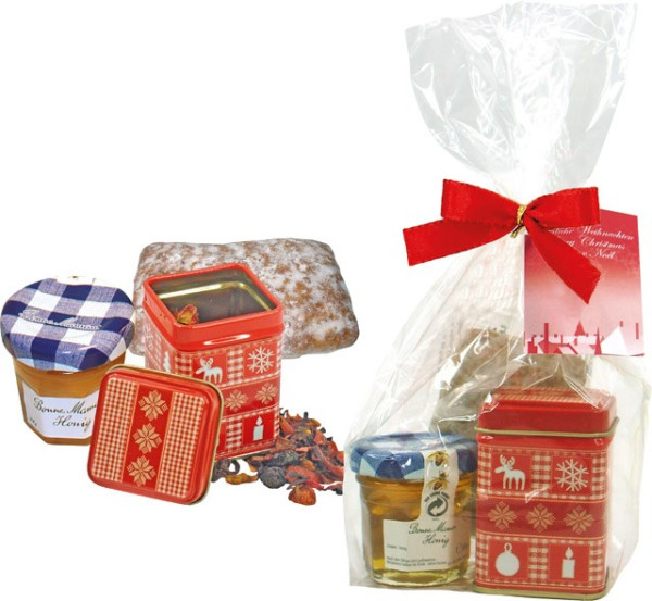 Dieses Präsente-Set enthält alles für gemütliche und behagliche Stunden in der Winterzeit und zu Weihnachten. Praktisch zum Überreichen wurde alles hübsch verpackt in der Klarsichttüte. Daher sieht man schon von außen die schöne kleine rote Dose mit dem Weihnachtsfrüchte-Tee, die Elisenschnitte sowie den Honig im Gläschen. Platz für den Werbedruck ist auf dem Standardmotiv des Anhängekärtchens oder eine eigene Gestaltung, jeweils bereits ab 100 Stück.
