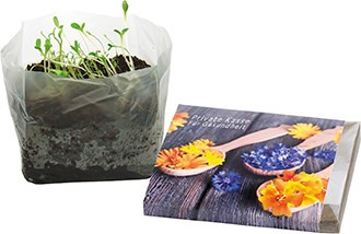 Die gewachsenen essbaren Blüten der Kornblume, der Ringelblume und der Gewürztagetes sind nicht nur als Pflanzen eine dekorative Augenweide, sondern auch ein ungewöhnliches Geschmackserlebnis. Ein echter Sympathieträger für Ihre Werbebotschaft. Der Schuber bietet Platz für Ihre Werbeanbringung auf dem Standardmotiv oder eine eigene Gestaltung, jeweils 250 Stück möglich. Inhalt: Erdtablette, Samen: Kornblume, Ringelblume, Gewürztagetes