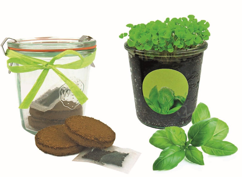 Ein Weckglas als transparentes Wachstumsbehältnis. Die aromatischen Basilikumblätter passen hervorragend zu Tomatengerichten. Das Haftetikett ist ein ständig sichtbarer Überbringer Ihrer Werbebotschaft. Ein Eindruck in das Standardmotiv oder eine individuelle Gestaltung des Etiketts ist jeweils bereits ab 250 Stück möglich. Inhalt: Weckglas (290 ml), Erdtabletten, Pflanzanleitung, Samen: Basilikum