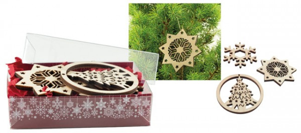 Die dekorativen Holzornamente schaffen auch bei Ihren Kunden schnell eine weihnachtliche Stimmung. Passende Aufhängehaken sind natürlich auch schon dabei. Die Einlegekarte im Standardmotiv bietet Platz für Ihre Werbeanbringung. Eine individuelle Gestaltung ist ebenfalls ab 250 Stück möglich. Inhalt: 3 Holzornamente (je Ø 50 mm), 3 Aufhänger
