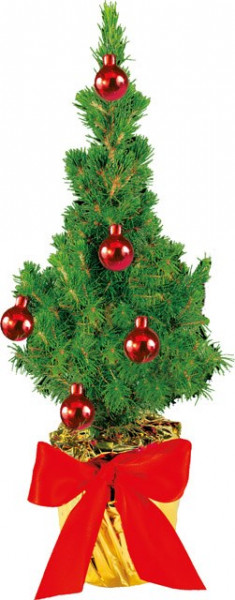 Inhalt: Bäumchen 20-30 cm geschmückt mit 5 roten Weihnachtskügelchen, Topffolie gold, Schleife rot
