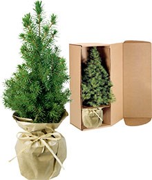 Eine lebende Zuckerhutfichte 20 - 30 cm, verpackt in einer Einzelversandkartonage, als kleines Bäumchen zu Weihnachten. Klassisch und dekorativ versetzt diese Zuckerhutfichte jeden Raum in eine weihnachtliche Stimmung. Das Bäumchen kann auf Wunsch von uns direkt an einzelne Empfänger versendet werden. Ganz natürlich wurde dieses Bäumchen nur mit Naturpapier und Bastband geschmückt. Ein Werbeeindruck kann auf unserem Anhängekärtchen Artikel 6202 (40 x 60 mm) ab 100 Stück erfolgen oder auf einer Beilage nach Wunsch. Zudem steht als Werbefläche ein separater Schuber, Art.-Nr. 4199-8, zur Verfügung.