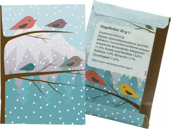 Wildvogelfutter im geklebten Tütchen. So können Ihre Kunden der Vogelwelt auch im Winter einen gedeckten Tisch bereiten und den daheimgebliebenen Vögel etwas Gutes tun. Ab 1.000 Stück ist eine individuelle Gestaltung möglich. Auf Anfrage ist auch ein Tütchen aus Graspapier möglich. Inhalt: Wildvogelfutter (ca. 20 g)
