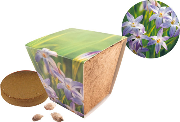 Die Sternblume begeistert mit ihren zarten, sternförmigen Blüten und erfreut sich großer Beliebtheit bei Bienen und Schmetterlingen, was sie zu einer wertvollen Bereicherung für die Biodiversität in allen Gärten macht. Der biologisch abbaubare Topf kann später komplett in die Erde gepflanzt werden. Ihr Werbeeindruck kann auf dem Standardmotiv der Banderole erfolgen. Ab 250 Stück ist ebenso eine individuelle Gestaltung möglich. Inhalt: Kokosfaser-Topf, Erdtablette, Samen: Sternblumenzwiebelchen